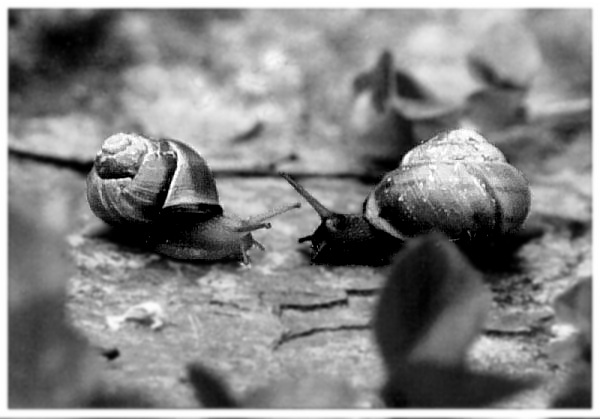 Vorsichtige Annäherung... Zwei Schnecken (ja, ich geb's zu - Schnecken sind eins meiner Lieblingsmotive) bei mir zu Hause im Garten. Fotografiert mit Canon EOS 300 und EF 50 1:1.8